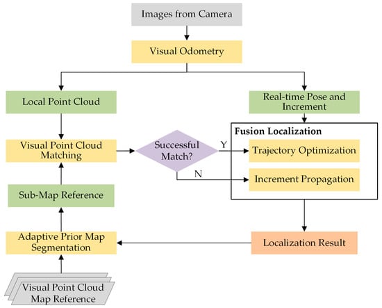 After determining the vehicle’s belonging road segment, we load keyframes located within the 100-m range ahead of the vehicle’s real-time position and observed map points as the sub-map matching reference instead of the entire map. The sub-map reference is updated in real-time during the vehicle’s movement to accelerate the matching speed. Visual odometry provides vehicle position in the initial stage, and later position is the fused localization output, which will be introduced in detail in Section 5.4.