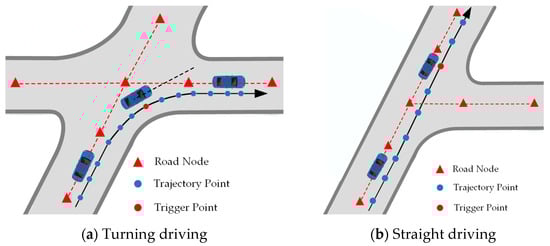 The authors of [44] define the smallest indivisible road segment as the road network basic element (RNBE) and propose the corresponding road network model. On this basis, we take the first node element as the fixed origin and convert the regional road network to the East-North-Up geographical coordinate system. Subsequently, we calculate the intersections between different roads and divide them into multiple RNBEs, i.e., the regional road network base. The definition of a single RNBE is given by Equation (1), where represents the set of nodes. and represent the head and tail turning points. The RNBEs with the same are mutually connected. represents the skeleton point group. Sequentially connecting them can approximate the shape of the road.