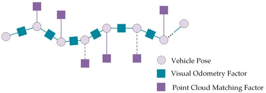 The visual odometry calculates the pose increment and outputs the vehicle pose at each moment starting from the initial frame. We transform the local point cloud based on the optimized pose and match it with the prior map. If the matching succeeds, the global pose graph provides the fusion localization result. If it fails, the vehicle pose is calculated based on the historical localization and the real-time increment output by odometry. We construct the global pose graph shown in Figure 7, where the vehicle pose at every frame serves as an individual node. The successful matching and localization results at irregular intervals provide global constraints for the visual odometry, as shown by the solid line connection factor. Similar to the loop closure correction in the classic SLAM system, this optimization framework distributes the drift error of odometry across the historical frames and performs batch adjustments, effectively maintaining the trajectory’s consistency.