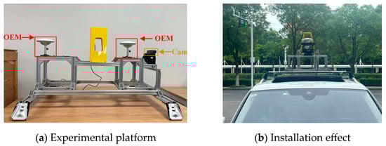 Experimental vehicle for the campus dataset: (a) shows the onboard experimental platform, with the ZED2 stereo camera in the yellow box and the RTK device in the red box. (b) shows the actual installation effect of the vehicle-mounted experimental platform.