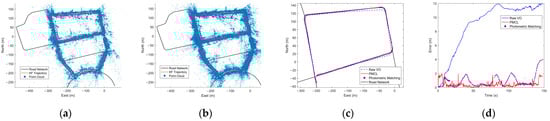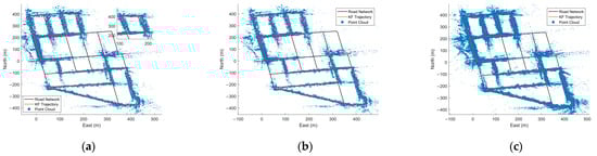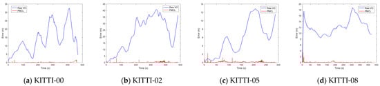 In the time period indicated by the red box in Figure 14c, the localization error of the PMCL method continuously increases. This is due to renovations of buildings around the road, which bring discrepancies between the prior VPCM and the actual environment landmark, leading to matching failures. Unlike the photometric matching method in [39], which cannot provide localization information during this phase, the PMCL method predicts the vehicle’s state based on the optimized historical trajectory and real-time odometry increments, while continuously matching the local point cloud with the VPCM. Although the localization error grows due to odometry incremental errors between adjacent frames, rapid correction can be achieved once successful matching occurs, as demonstrated by the quick reduction in error shown in Figure 14. The PMCL method utilizes the advantages of both odometry and map matching. Odometry can provide localization information in cases of matching failure and prior information for subsequent matching, while map matching results can, conversely, suppress odometry drift.