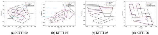 To evaluate the map construction and matching localization performance of the proposed method, we conduct experiments on the public and real-world datasets. In the map construction experiments, as shown in Figure 9, Figure 12, Figure 13 and Figure 14, the VPCM constructed by the SAMC method is corrected to the road areas and has a higher density compared to the methods in [39,43]. Table 1 demonstrates that the SAMC method achieves higher data extraction efficiency and accuracy, and requires less storage space. In the localization experiments, Figure 10, Figure 11, Figure 12, Figure 13 and Figure 14 indicate that the PMCL method effectively corrects the localization trajectory to the road areas and suppresses the cumulative drift. Table 2 shows that the PMCL method surpasses most map-based methods in accuracy. On more challenging real-world datasets, compared to the similar camera-based method in [39], the PMCL method demonstrates higher matching success rates and localization accuracy, as shown in Table 4.