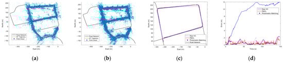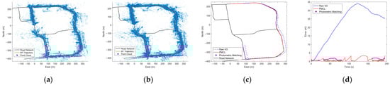Results of the real-world experiment E1. (a,b) show the mapping effect of the method in [39] and the SAMC method. (c,d) show the localization trajectories and error curves over time of the original odometry, the photometric matching method in [39], and the PMCL method.