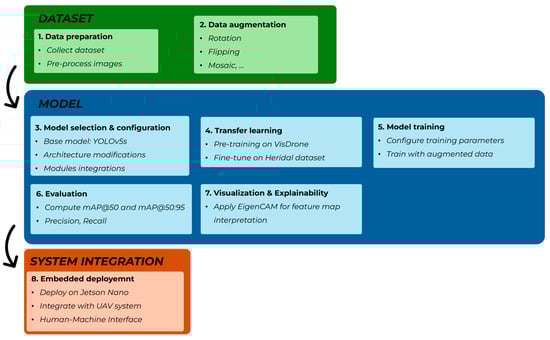 Dataset selection and preparation, applying pre-processing steps such as resizing, bounding box selection, and splitting the dataset into train, validation, and test sets and applying data augmentation techniques like rotation, flipping, mosaic, copy-paste of small objects;