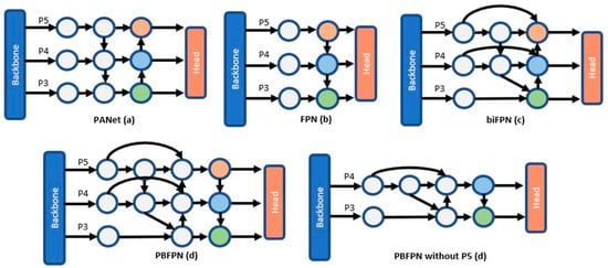 We investigated the impact of different feature fusion strategies on small-object detection by replacing PANet with FPN, BiFPN, and PB-FPN [
