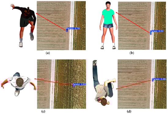 More tests have been conducted using YOLOv8s-PBFPN to highlight its detection abilities in scenarios where missing people must be found. The same background as the collected video was used. However, it has been possible to create different humanoid figures with different clothes, positions, gender, and skin color using “MakeHuman” open-source software v1.3.0.