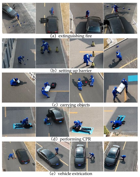 As illustrated in Figure 2, the video frame dataset under consideration comprises a subset of footage that captures a variety of actions carried out by accident rescue workers. These include fundamental movements and rescue operations, such as running, squatting, firefighting, setting up roadblocks, and carrying supplies. The dataset also illustrates different levels of traffic accident damage, collision gestures, and the positioning of rescue vehicles. The considered dataset highlights the complex characteristics of the traffic accident scene. Furthermore, this dataset reflects challenging environmental factors, such as high vehicle density at the accident site, mutual occlusion, flame and smoke obstacles, and different lighting conditions. All of these pose significant challenges to the accuracy of subsequent model action recognition and the optimization strategies adopted.