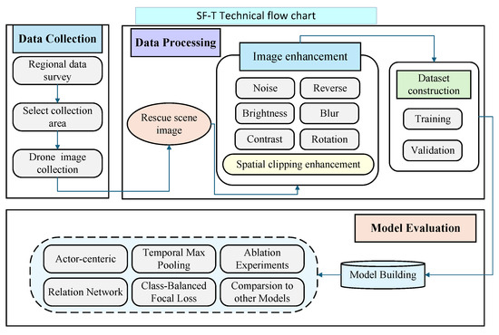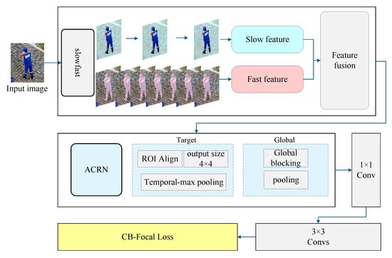 The SF-T model proposed in this paper makes several improvements on the standard SlowFast architecture. The original shared head is replaced by an ACRNHead (Actor-Centric Relation Network Head) [29]. The temporal maximum polling method [30] is incorporated to eliminate superfluous static background information in the temporal dimension. CB-Focal Loss has been employed to replace the original cross-entropy loss [31], with the aim of effectively reducing the class imbalance caused by the short duration of special rescue actions. The occurrence of rescue actions, which are typically confined to specific scenes (e.g., firefighting actions are usually only observed in scenes where fires are present), can lead to the occlusion of special rescue actions (e.g., smoke typically obscures the visibility of the fire scene), resulting in a paucity of qualified data samples and an undue influence of the discrepancy between difficult and easy samples on the discriminant ability of the model. The extraction parameters of the ROI head [32] were reduced to further optimize the performance. The main steps are as follows: