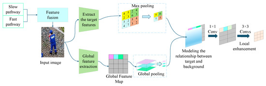 The relation features are enhanced by 3 × 3 convolutions to obtain local context information. The enhanced feature vectors are generated by feature fusion of target features and background features, and, finally, the action recognition task is completed, as shown in Equation (5) [29].
