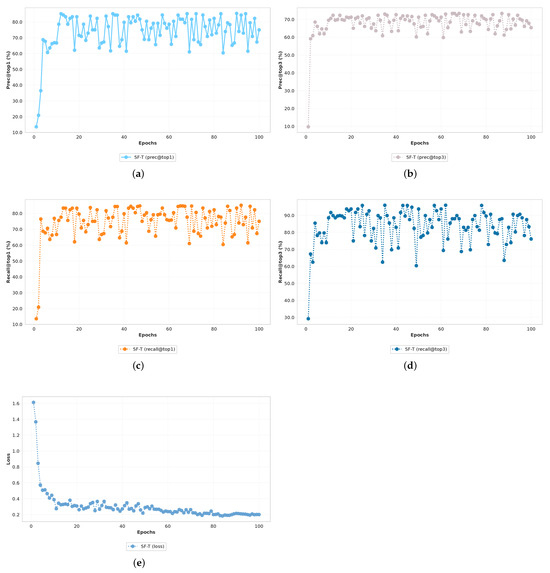 The SF-T model was trained over 100 epochs of 200 iterations each for a total of 20,000 iterations. We recorded the changes in the model’s precision, recall, and loss. Figure 5 shows the evolution of these indicators during the training process.