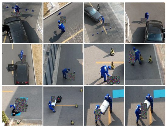 It is acknowledged that the actual scene of UAV aerial photography and the scene of traffic accidents are characterized by greater occlusion and complexity in the background. In light of this, the present paper introduces random erasing data augmentation [36]. Within the context of video data, this approach emulates scenarios where the target is occluded and the background undergoes significant alterations. The primary objective of this methodology is to enhance the robustness of the model in the face of occlusion and background variations. When employed in conjunction with an enhanced data enhancement method based on the standard SlowFast architecture, it has been demonstrated to enhance the robustness and adaptability of the model, thereby mitigating the risk of overfitting to a certain extent. The efficacy of random erasing data augmentation is demonstrated in Figure 7.