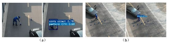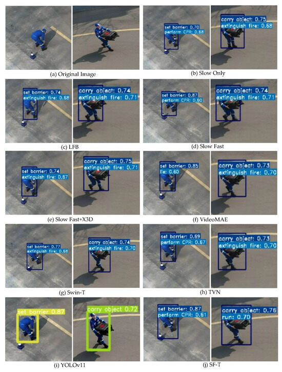 To further verify the advantages of SF-T, we supplement the comparison with YOLOv11 [39], the latest basic model in the field of object detection. It was adapted and adjusted to a composite task of “target detection + action classification”: the positioning module was retained to output the main bounding box, the classification head was replaced with the rescue action prediction layer, and the same training protocol as SF-T was used to fine-tune on the dataset. The results show that although the positioning accuracy of YOLOv11 is competitive, the action recognition accuracy is slightly lower than that of SF-T. The reason is that as a static detection model, YOLOv11 lacks the ability to model time series information, and it is difficult to capture the movement trend and spatio-temporal correlation dependent on rescue actions. The dual-path design of the SF-T and ACRN modules are naturally suitable for spatio-temporal positioning tasks and specially optimized for agent–action recognition in dynamic scenes, which is more suitable for the requirements of this task. A diagram comparing the effects of YOLOv11 and SF-T is shown in Figure 10.