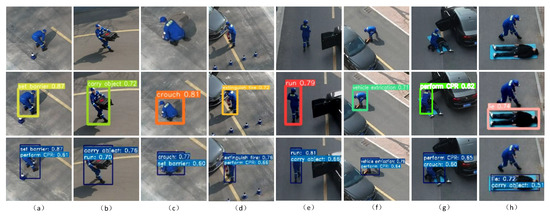 Comparison of the detection effects of YOLOv11 and SF-T: (a) setting barrier; (b) carrying object; (c) crouching; (d) extinguishing fire; (e) running; (f) vehicle extrication; (g) performing CPR; (h) lying.