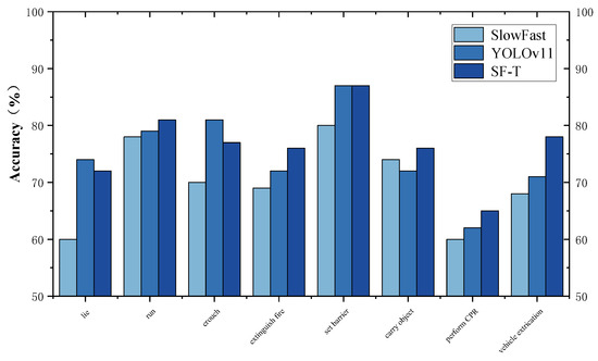 As illustrated in Figure 11, a comparison was conducted among the standard SlowFast model, YOLOv11, and the SF-T model in terms of their performance on the aerial photography dataset under identical conditions. The results indicate that the SF-T model outperforms the other two models in five out of eight categories, with one category showing equivalent performance to YOLOv11. Specifically, compared to the currently state-of-the-art YOLOv11 model, SF-T achieves a 7% higher mAP in detecting demolition actions and a 4% improvement in identifying fire extinguishing actions, particularly in complex scenarios where there is a strong interrelation between the target and its background. This improvement can be attributed to the SF-T model’s enhanced capability in jointly extracting and modeling both objects and their surrounding context. These experimental findings validate the effectiveness of the proposed approach.