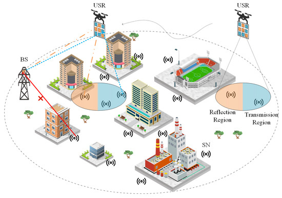 In time slot n, we classify the SNs within the coverage area into two categories based on their relative positions to the USR: the left-side SN set and the right-side SN set . The transmission/reflection mode for SNs in is determined by their positional relationship with the USR during time slot n. We introduce a binary indicator to denote the reflection/transmission mode, where indicates reflection mode and indicates transmission mode. The transmission mode indicator for is given by