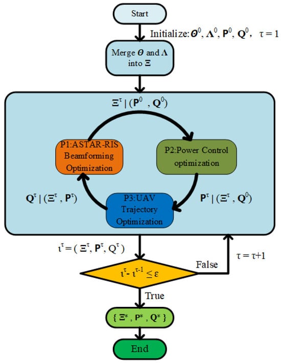 In this subsection, we decompose the original optimization problem into three subproblems based on the optimization variables: the active STAR-RIS beamforming subproblem , the power control subproblem , and the UAV trajectory design subproblem . We then propose an AO algorithm to solve them sequentially, whose flow diagram is illustrated in Figure 2.
