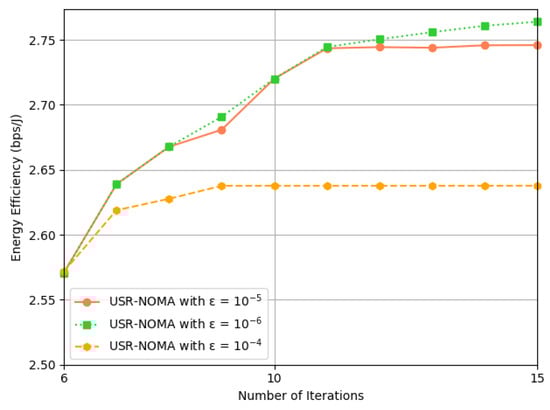 First, As shown in Figure 3, we compared the convergence value . Other experimental parameters were set as , and . It can be seen that when to , convergence was achieved in just two rounds, and the EE performance increased by 3.7%, equivalent to a 1.9% improvement in performance per round of iteration. When , the EE performance only increased by 0.8%, and the number of iteration rounds significantly increased. In conclusion, in the following experiments, in order to balance performance and convergence speed, we set the value of .