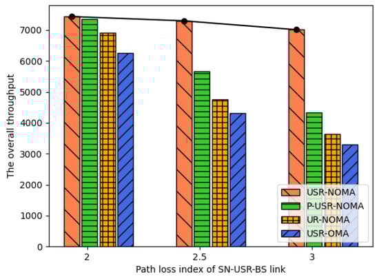 The overall throughout versus path loss index of SN-USR-BS link.