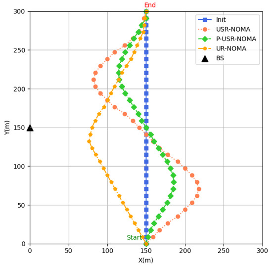 Figure 6 illustrates the trajectories of the three schemes after multiple iterations. Under the USR-NOMA scheme, the USR initially tends to collect data from edge devices to ensure DCCR, and compared with the P-USR-NOMA scheme, the USR flies farther away from the BS. This behavior occurs because the active STAR-RIS provides improved coverage capability by overcoming the relatively weak performance gain from multiplicative fading in long-distance scenarios. Additionally, it can be observed that the proposed scheme’s trajectory generally remains longer in the central region, a phenomenon that is more pronounced in the P-USR-NOMA scheme. For the UR-NOMA scheme, since the conventional RIS can only transmit data, the USR tends to fly toward the edge and stay closer to the BS to maximize the number of served SNs. While this approach sacrifices some DCCR compared to the STAR-RIS schemes, it ensures better signal quality reception at the BS.
