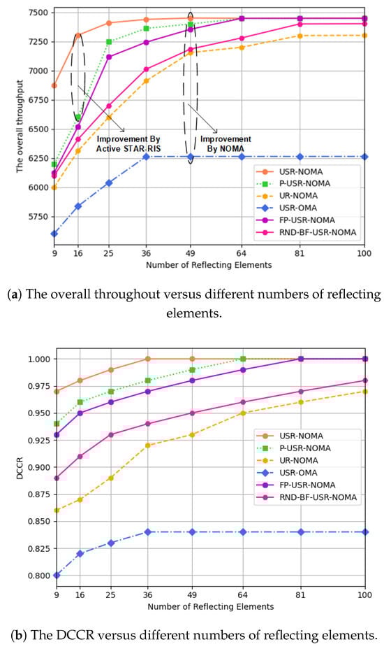 (a) The overall throughout and (b) DCCR versus different numbers of reflecting elements.