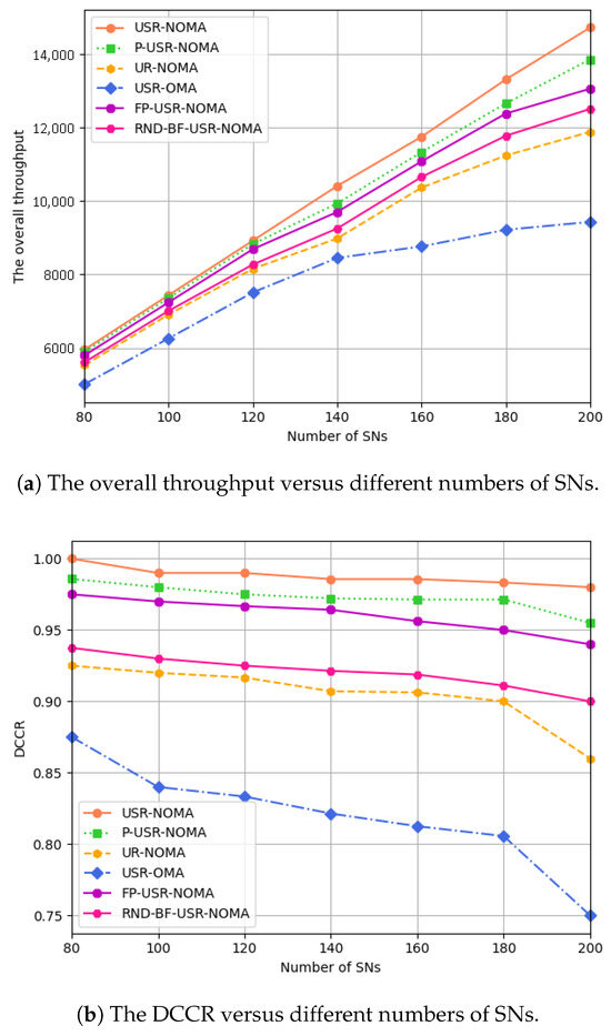 (a) The overall throughput and (b) DCCR versus different numbers of SNs.