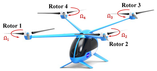 Single-passenger quadrotor aircraft. Reprinted with permission from Ref. [25], © 2021, Cambridge University Press. The red arrows indicate the rotation direction of each rotor.