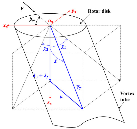 To account for aerodynamic interference between rotors, an improved vortex-tube-based inflow model is introduced. Each rotor is modeled using a straight vortex tube based on classical vortex theory and the Glauert rotor model [26], assuming continuous tip vortex shedding and neglecting radial contraction and axial feedback effects [27], as illustrated in Figure 2. In this diagram, denotes the disk-averaged induced velocity, represents the inflow ratio induced by freestream velocity, and denotes the advance ratio. The rotor wake skew angle is decomposed into two components, and , corresponding to projections of the wake skew angle onto the - and - planes, respectively.