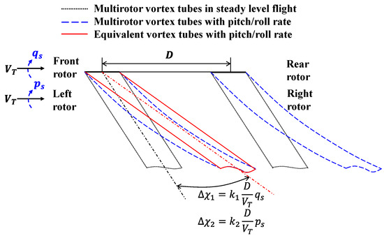 During flight, the rotor wake no longer remains straight but curves due to the aircraft’s angular motion. This curvature can be equivalently modeled by introducing additional rotor wake skew angles and , which account for the effects of pitch and roll rates, respectively, as illustrated in Figure 3. In this diagram, denotes the distance between front–rear or left–right rotors, and represent the pitch and roll rates in the rotor shaft axes, and is the total velocity through the rotor disk. The coefficients and are time scale factors associated with wake response dynamics.