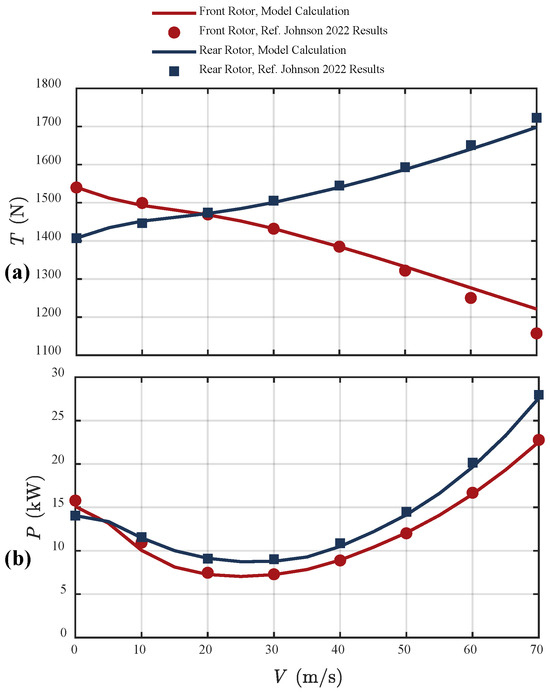 The key design parameters of the quadrotor configuration used in this study are listed in Table 1, based on data from established sources [33]. This configuration features a vertically staggered rotor arrangement, in which the rear rotors are located above the front rotors. To assess the fidelity of the developed quadrotor flight dynamics model, its trim results—including rotor thrust and power requirements over the full velocity envelope (0–70 m/s)—are compared with reference data from Johnson and Silva [25], as illustrated in Figure 4.