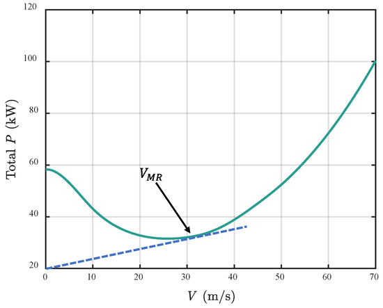 Variation in total power with forward speed. The blue dashed line represents the tangent passing through the origin.