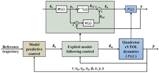 This section presents a hierarchical control architecture for autonomous trajectory tracking, composed of an outer MPC loop for trajectory tracking and an inner loop implemented by EMFC. The EMFC itself features two cascaded sub-loops: an outer loop responsible for following translational velocity and yaw rate commands, and an inner loop dedicated to attitude/altitude stabilization. Operating in closed-loop with the quadrotor eVTOL dynamics model, this hierarchical controller ensures improved trajectory tracking accuracy and convergence performance, as depicted in Figure 6. In the diagram, the EMFC structure consists of the command model , the inverse plant , and the feedback compensation . The input represents the stick input, is the state output from the command model, is the output of the inverse plant, denotes the output of the feedback compensation, and is the actuator control input.