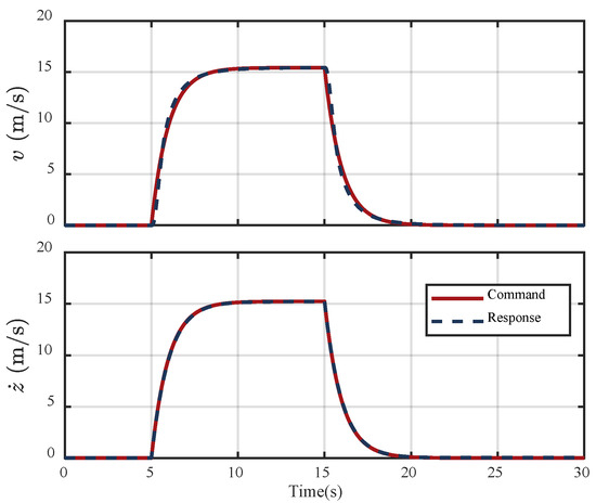 Then, we use the maximum achievable lateral velocity (15.43 m/s) and climb rate (15.24 m/s), as defined in the agility performance boundaries of Table 2, as step inputs to evaluate the validity of the linear prediction model in Equations (12) and (13) under large velocity deviations. Figure 7 shows that the resulting lateral and vertical velocity responses accurately follow the commanded values, exhibiting near-perfect tracking. These results indicate that, within the feasible velocity envelope, the controller maintains high tracking fidelity. Accordingly, the linear prediction model provides sufficient accuracy across the specified flight envelope, thereby justifying the linearization assumptions adopted in the formulation of the state constraints in Equation (23).