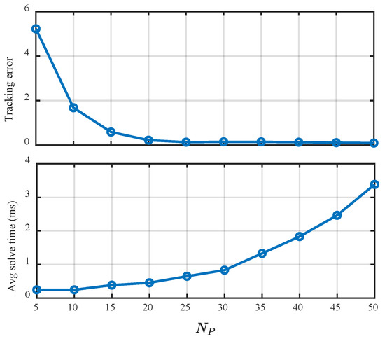 As shown in Figure 8, the tracking error decreases significantly as increases from 5 to 20 and reaches near zero beyond , indicating that larger horizons offer no significant improvement in accuracy past a certain threshold. In contrast, the average solve time grows moderately up to , but then increases rapidly due to the larger optimization problem size. Based on this trade-off, is selected as a practical and balanced choice.