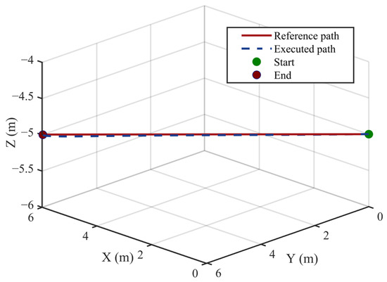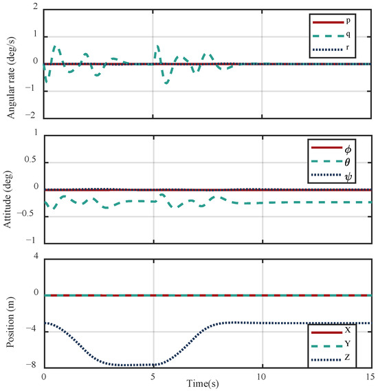 Figure 19 presents the simulation results, including the time histories of angular rates, attitude angles, and position components. As shown in the figure, the position along the x- and y-axes remains nearly constant throughout the maneuver, indicating effective lateral stability and the absence of significant horizontal drift during vertical transitions. Along the z-axis, the altitude increases from 3.048 m to 7.62 m during the ascent phase, remains stable for 2 s, and then returns smoothly to the original altitude during the descent phase.