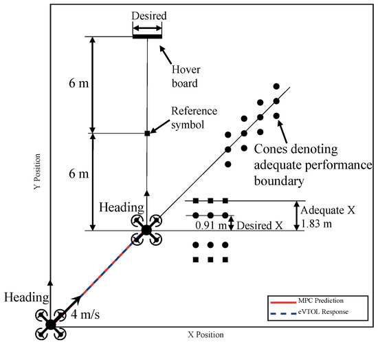 The Hover task is designed to evaluate the quadrotor aircraft’s ability to maintain the precise control of position, heading, and altitude. The aircraft enters the maneuver at an altitude of 5 m above ground level with a ground velocity of 4 m/s at a 45° angle relative to the aircraft’s body axis. Upon reaching the target hover point, it transitions to a steady hover and maintains this state for at least 30 s. The performance criteria for this maneuver are defined in Table 3 according to the ADS-33E-PRF standard.