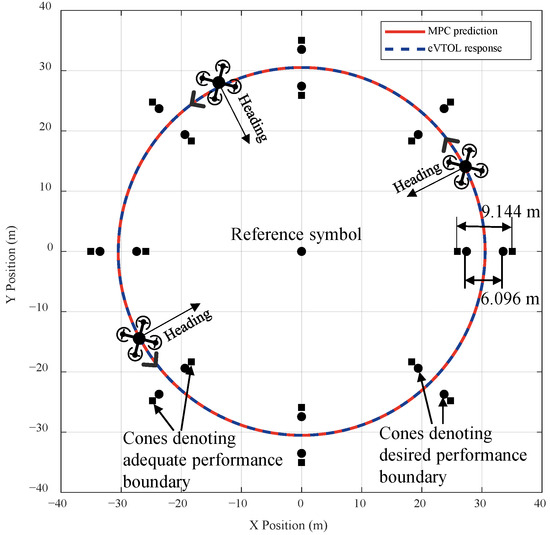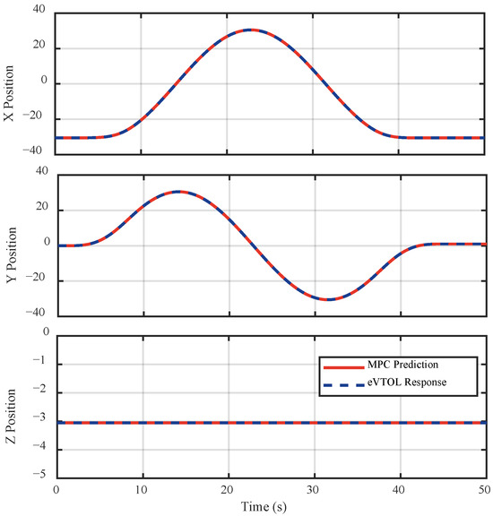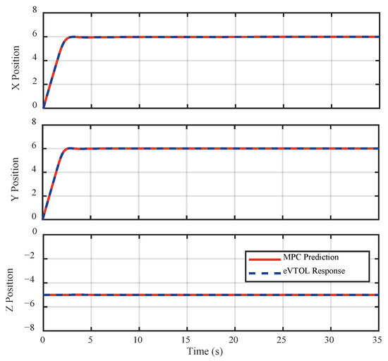 Figure 16 and Figure 17 present the top-view (X-Y plane) comparison and the position components of the predicted trajectories by the MPC layer and the actual responses of the eVTOL during the Pirouette Maneuver. The close agreement between the MPC predictions and the aircraft’s responses indicates that the aircraft successfully tracks the desired circular trajectory while maintaining precise control over position, heading, and speed throughout the maneuver. From Figure 17, it can also be inferred that the aircraft completes the pirouette in approximately 45 s and subsequently maintains a stable hover for 5 s, meeting the desired performance criteria outlined in Table 5.