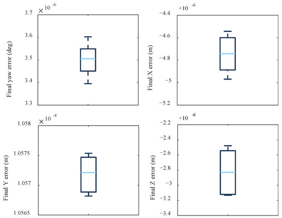 The distribution of final state errors—specifically, the position and yaw angle errors after task completion—is illustrated in Figure 13 using boxplots. The results demonstrate that the errors across all 100 trials are consistently small and well-contained within a narrow range, with no outliers observed in the boxplots. This indicates a high level of robustness and repeatability in the closed-loop system response. The controller successfully drives the aircraft to complete a 180° rotation maneuver while maintaining position stability. These outcomes confirm that the proposed MPC–EMFC hierarchical controller is capable of reliably handling realistic uncertainties while meeting stringent flight performance requirements.