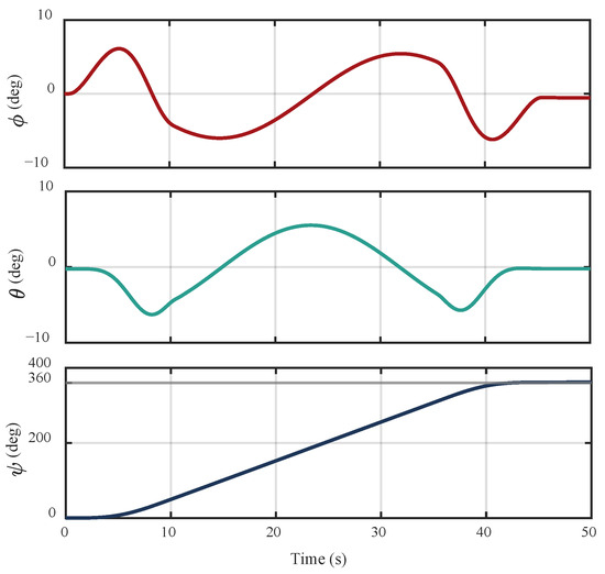 Figure 14 shows the time history of the aircraft’s attitude angles. It can be observed that the yaw angle increases continuously from 0° to 360°, indicating that the aircraft completes a full rotation as intended. The roll and pitch angles remain within throughout the maneuver, as the aircraft continuously adjusts its attitude to maintain trajectory accuracy and stability during the circular flight.