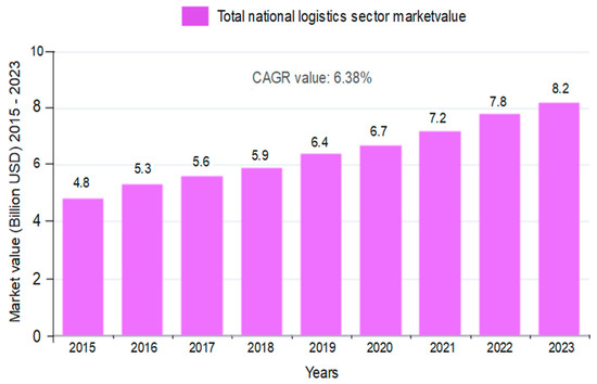 Global data indicate that in 2023, logistics expenditure reached approximately USD 80 billion, with last-mile transportation accounting for nearly 50% of the total cost. As shown in Figure 2, Pakistan’s logistics sector has experienced steady growth over the past eight years, expanding from an estimated USD 4.8 billion in 2015 to around USD 8.2 billion in 2023, reflecting a compound annual growth rate (CAGR) of approximately 6.38% [14]. According to the China Federation of Logistics and Purchasing, China’s total logistics cost in 2022 was approximately CNY 13 trillion, marking a 7.1% year-on-year increase and representing 14.7% of the country’s GDP [14,15]. Notably, last-mile logistics comprises more than 30% of the total logistics expenditure, underscoring its significance and the pressing need for cost reduction. As a result, optimizing last-mile delivery has become a focal point for both researchers and logistics enterprises. In Pakistan, efforts to modernize last-mile logistics through drone technology are gaining momentum. For instance, in June 2021, Careem launched a drone delivery pilot in Lahore and Karachi, aiming to evaluate the feasibility of UAV-based food delivery [15]. Similarly, Foodpanda conducted trials using Vertical Take-Off and Landing (VTOL) drones as part of their initiative to enhance delivery efficiency and reduce operational costs in urban settings [15,16].