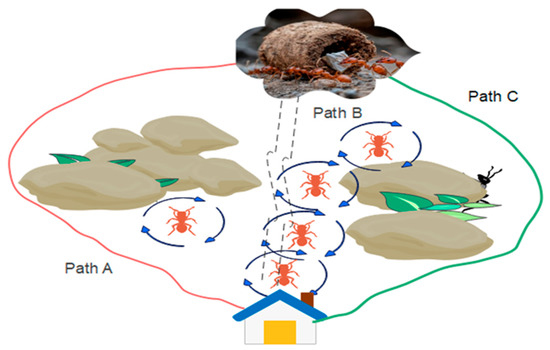 ACO was developed by Italian researcher Marco Dorigo [7]. It generalizes previous algorithms under a unified metaheuristic framework, providing an abstract and standardized description for solving complex optimization tasks. ACO is particularly effective for addressing combinatorial optimization problems due to its adaptability and positive feedback mechanism [7]. The core principle of ACO is inspired by the foraging behavior of real ants, which rely on pheromone trails to communicate and identify efficient paths to food sources. Ants deposit pheromones along their paths, and the intensity of these trails influences the probability of path selection by other ants, reinforcing shorter and more optimal routes through positive feedback [7]. As illustrated in Figure 3, ants traversing Path B reach the food source more quickly and deposit a higher concentration of pheromones within the same timeframe. This feedback mechanism causes subsequent ants to favor Path B, ultimately converging on Path B as the shortest and most efficient route.