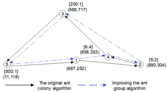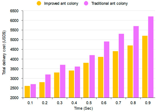 It is shown that route B is the shortest distance, and route A has a greater sum of distances than B. However, due to the low speed of the logistics vehicle, there will be a delivery timeout at both times of delivery. Therefore, for the optimization of comprehensive costs, the improved ACO selects a fourth delivery point with a high penalty factor to prioritize, thus avoiding greater penalty time costs. The overall cost of route A is 2826.22. The combined cost of route B is 3012.02. − = 185.8. From this result, route A obtained by the improved ACO has a smaller overall cost, so it illustrates the optimization effect of the improved ACO.