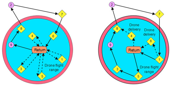 Currently, the collaborative use of logistics vehicles and drones for parcel delivery remains an emerging and underexplored field. The development of planning algorithms for coordinated delivery involving multiple drones and vehicles is critical to achieving systematic, efficient logistics solutions [22]. Compared to traditional vehicle-only delivery methods, collaborative algorithms significantly reduce both total delivery time and transportation cost. Empirical studies and simulations have demonstrated that the incorporation of drones in last-mile logistics can effectively lower delivery costs. With drone technology becoming increasingly mature, the feasibility of integrated drone–vehicle logistics systems is improving. This study introduces a collaborative delivery framework that coordinates drones and logistics vehicles to perform optimized parcel distribution tasks [23]. For a specified delivery area, a path optimization algorithm is implemented at the theoretical level to coordinate the routes of both drones and vehicles. Compared to conventional delivery approaches, this method achieves meaningful reductions in overall cost and delivery time. These results offer valuable theoretical insights and practical guidance for the future design and deployment of collaborative urban logistics systems.