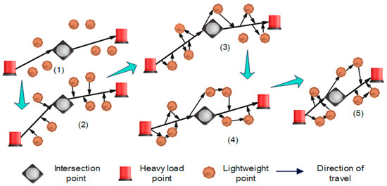 For ground logistics vehicles, routing must be planned over an actual road network, considering the spatial distribution of designated delivery points, referred to as heavy points. To minimize driving costs, the objective is to determine the shortest driving path between these points based on the road network’s structure and traffic conditions [6]. This involves calculating both the shortest path length and the actual driving route between each pair of heavy points.