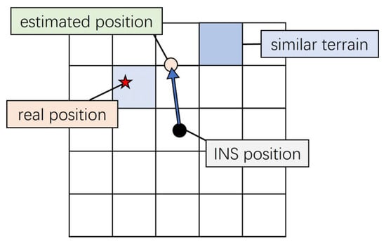 The robustness of the PF algorithm remains insufficient in self-similar terrains or fuzzy measurements. Figure 1 shows that when terrains with similar heights exist in the search area, the estimated position of the PF will be misled.
