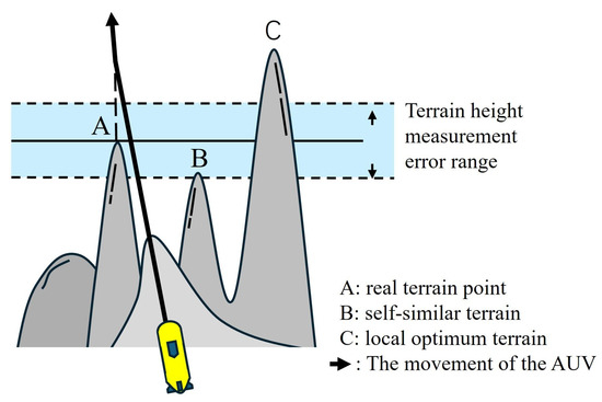However, TAN methods based on optimization algorithms often struggle to achieve stable navigation performance under the influence of the terrains with similar height. These terrains with similar height are categorized into similar terrain and local optimum terrain. Specifically, the height of similar terrains exhibits the same or higher measurement correlation compared to the actual terrain. This renders such terrain impossible to distinguish using any correlation-based methods. As illustrated in Figure 2, when terrain height measurements fall at the lower bound of the error margin, point B matches the measurements better than the true terrain position. Local optimum terrain shows a slightly inferior correlation with measurements compared to the actual terrain. If the algorithm fails to explore the true terrain, this suboptimal solution may be selected, thereby disrupting the navigation process.