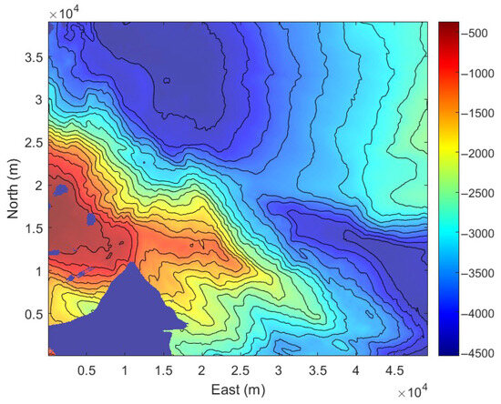 To validate the accuracy and robustness of the navigation method, simulations were conducted based on the DEM map of a real seabed, as shown in Figure 7, that was released by the United Kingdom Polar Data Centre [37]. This DEM was compiled from multibeam echosounder data collected by multiple vessels within the selected areas within the Orkney Passage, Scotia Sea.