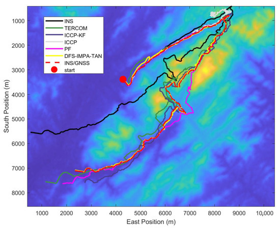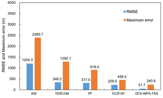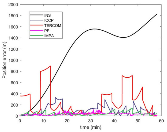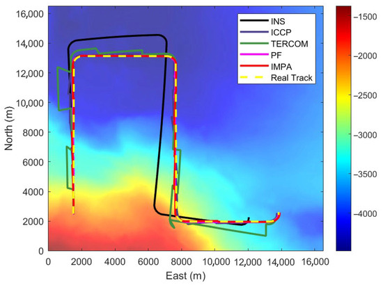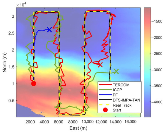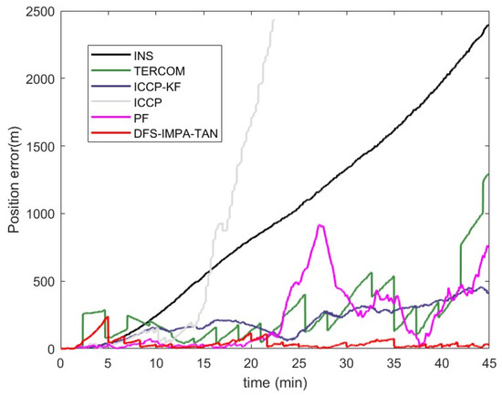 According to the simulation results, it was found that the navigation accuracy of DFS-IMPA-TAN is slightly lower than that of the PF under the suitable conditions. This result can be attributed to a characteristic of the batch processing method: its periodic correction of navigation information rather than real-time correction. This work characteristic limits the precision of DFS-IMPA-TAN. However, owing to the powerful optimization capability of the IMPA algorithm, the transformations it found were closer to the real trajectories. Therefore, its navigation accuracy was significantly better than those of ICCP and TERCOM algorithms, which are also batch processing methods.