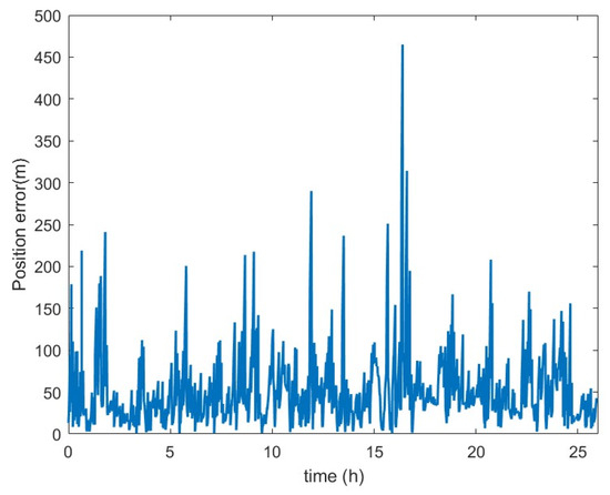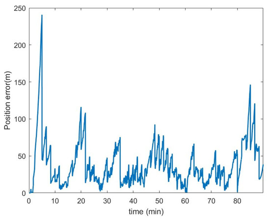 The number of sample times of the DFS-IMPA-TAN framework in this experiment was set to 100, which means that the KF update was performed at 100-s intervals. Due to the flat terrain at the foothill at the beginning of the experiment, the DFS-IMPA-TAN framework led to an incorrect position by similar topographical features. However, the navigation position was successfully corrected back near the true position by visiting other nodes based on a robust tree. The complete experimental results and the correction effect of the robust tree are shown in Figure 21. The navigation error of the DFS-IMPA-TAN framework is shown in Figure 22. There is an extremely large peak that triggered the robust tree correction mechanism and several smaller peaks within the acceptable limits in the error curve.