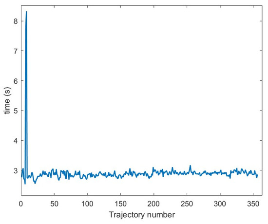 Furthermore, to validate the real-time performance of the algorithm, during its execution, the system records the current time whenever the robust tree advances to the next layer. Upon completion of the entire simulation, differences are computed from the recorded time series. This establishes the time required to process a single trajectory segment. This duration encompasses the entire process, including INS update, IMPA matching, and robust tree computation. The differential results are plotted in Figure 13.