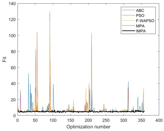 In simulation test III, the parameters for the optimization algorithms PSO and F-WAPSO were set according to reference [33]. The optimization algorithm ABC was the standard artificial bee colony algorithm, implemented as described in reference [38]. It is worth noting that the optimization algorithm used in reference [33] employed 100 particles over 100 iterations, while the MPA algorithm typically uses 30 particles over 500 iterations. To ensure the rigor of the simulation test, the PSO and F-WAPSO algorithms were calculated using two configurations: 30 particles for 500 iterations and 100 particles for 150 iterations, and the superior optimization results were selected.